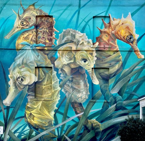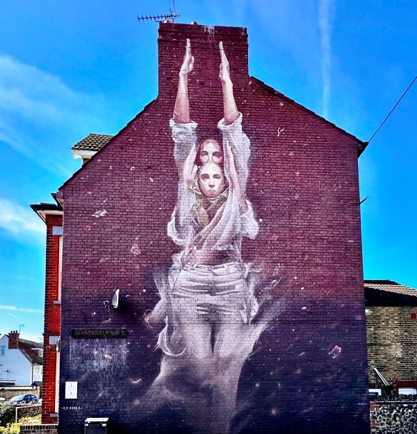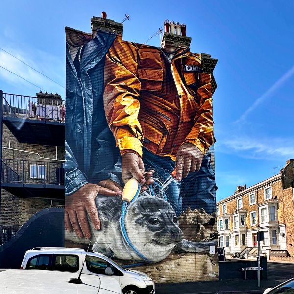 Unter dem Namen ‚Rise Up Residency‘ kamen im Herbst 2022 (25. September – 2. Oktober) 17 zeitgenössische Künstler aus aller Welt nach Margate und Cliftonville, um mehrere Murals zu schaffen, die für den Schutz der Meere sensibilisieren und auf die durch Plastikmüll verursachten Probleme in und um unserer Ozeane hinweisen sollen.